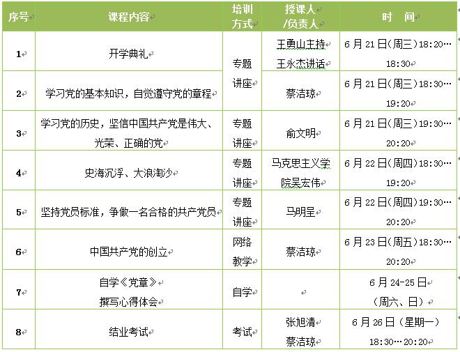 根据学院党校培训计划要求,结合学校入党积极分子的实际,本次培训以党的基本理论和基础知识为主要培训内容,培训课共8学时,通过集中讲授、自学、讨论交流、考试等形式完成本次培训。培训成绩合格者党校予以结业并颁发《结业证书》。培训课程及时间具体安排如下: