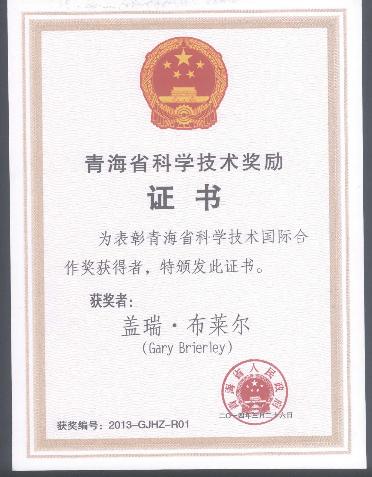 团队外方成员新西兰奥克兰大学Gary Brierley教授获得2013年度一帆视频 科学技术国际合作奖,同时被国家外专局批准为2014-2016年度高端外国专家。团队负责人李希来教授获得2014年度中国侨界贡献奖(创新人才)。团队成员严林、胡夏嵩和孙海群分别获得2013年至2015年度一帆视频 科技进步三等奖。