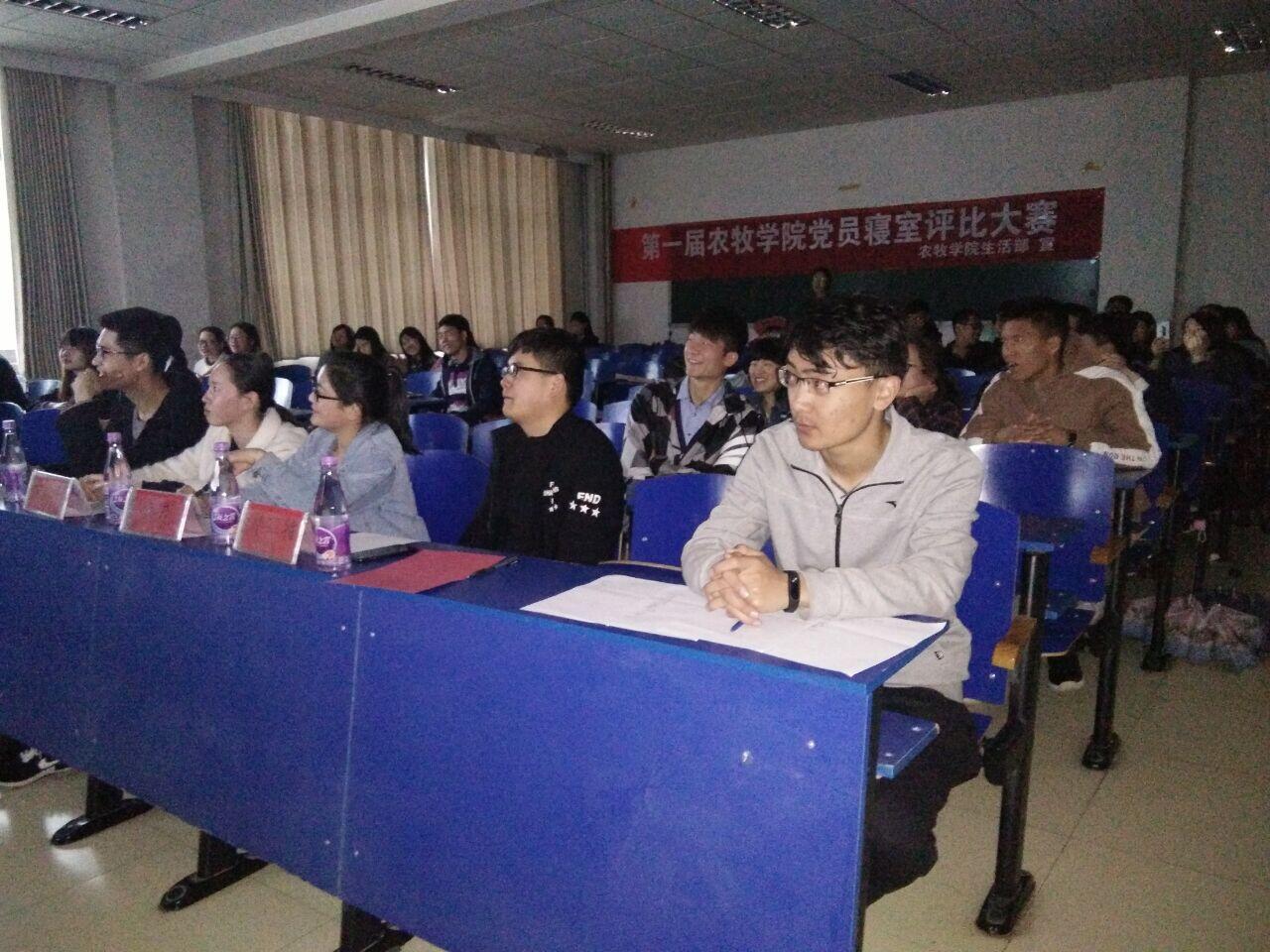 晚上七点半,院学生会生活部在102会议室展播党员寝室小视频。首先主持人宣布了大赛规则,公示了近两个月各党员宿舍卫生检查评分情况;播放了各个党员寝室的小视频,视频内容以展示寝室建设文化和学习习近平总书记系列讲话、“两学一做”精神为主,激励同学们积极努力地向党组织靠拢。最后,由评委综合评定打分。农林系366寝室和农林系动科系 122寝室分别获得一等奖;动科系458寝室、动医系212寝室和动科系454寝室分别获得二等奖;动科系455寝室、动医系267寝室、农林系225寝室分别获得三等奖。