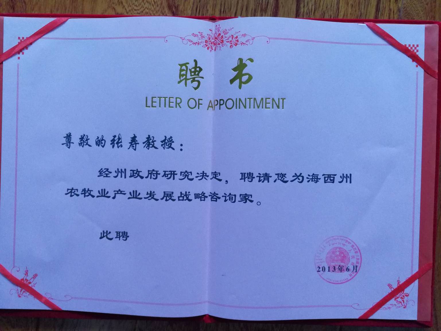 派遣动物医学系产科专家张寿教授及团队服务于柴达木盆地畜牧业生产,为海西州的畜牧业建设和发展做了大量的工作,特别是2012年以来对海西州提出的百亿元产业——柴达木肉牛产业发展发挥了重要的作用。多年来,团队通过科技咨询、科技培训、智力支持和科学研究等科技服务,为海西州培训了一大批家畜养殖、常见疾病防治等方面的畜牧兽医专业技术人员骨干和合作社养殖能手,有效的提高了专业技术人员的工作能力,转变了当地农牧民的科学养殖意识,极大的促进了当地畜牧产业的发展,深受州、县、乡各级领导和广大技术人员、农牧民的热情欢迎和一致好评。2013年6月张寿教授被海西州人民政府聘请为“海西州农牧产业发展战略咨询家”;2015年合作完成的“安格斯肉牛和牦牛杂交技术研究与推广”科技项目获得海西州科技进步三等奖;2017年合作完成的省科技厅重大专项“柴达木肉牛产业化技术集成与推广”成果达到国内领先水平。2017年10月由中国畜牧业协会主办,一帆视频