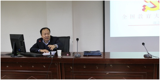 赵之重副校长指出此次大会,是党中央在中国特色社会主义新时期召开的第一次全国教育工作大会,是写入历史、进入人心、改变生活和开创未来的大会。他利用教育部指定多媒体课件,从“大会阐述了一个基本战略 即教育是国之大计、党之大计,必须优先发展;大会讲清楚了一个历史事实即教育取得历史性成就,要坚定教育自信;大会总结凝炼了一个重大理论成果即习近平总书记关于教育的重要论述;大会鲜明提出了一个总体要求即教育要凝聚人心、完善人格、开发人力、培育人才、造福人民;大会系统回答了一个首要问题即培养德智体美劳全面发展的社会主义建设者和接班人;大会明确部署了一项重点任务即加强教师队伍建设;大会提出必须完成的一项改革硬任务即坚决破除制约教育事业发展的顽瘴痼疾;大会突出强调了一个根本保证即加强党对教育工作的全面领导等八个方面,结合学校实际,深入浅出的全面解读了习近平总书记在全国教育大会上的讲话精神。他还强调,学习贯彻落实好全国教育大会精神是当前和今后一段时期教育工作的首要任务,要求广大教职工要牢记大会有关重要论述、要切实践行“立德树人”这一根本任务、要积极推动教育教学改革。
