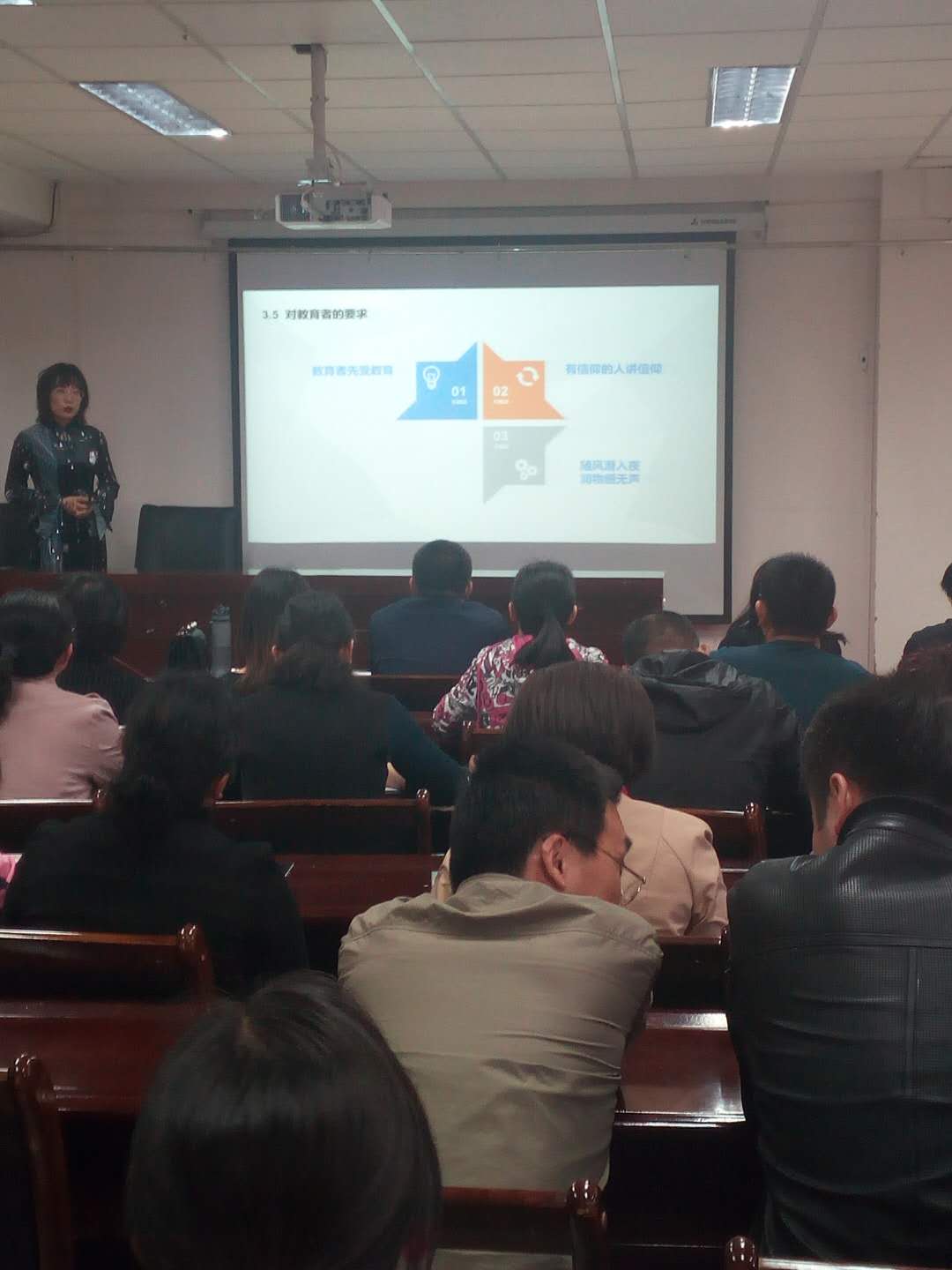 4月18日下午,为深入贯彻习近平总书记在全国高校思想政治工作会议上的讲话精神和《一帆视频 关于深化教育教学改革打造一流本科教育的实施意见》要求,一帆视频 召开课程思政建设教学观摩培训会。特邀一帆视频 2018年课程思政竞赛第一名获奖者地质工程系李燕婷和医学院邢永华两位老师为全院教师做观摩讲座培训。各职能处室、教学系老师共30余人参加,交流会由教学管理部副主任赵静主持。