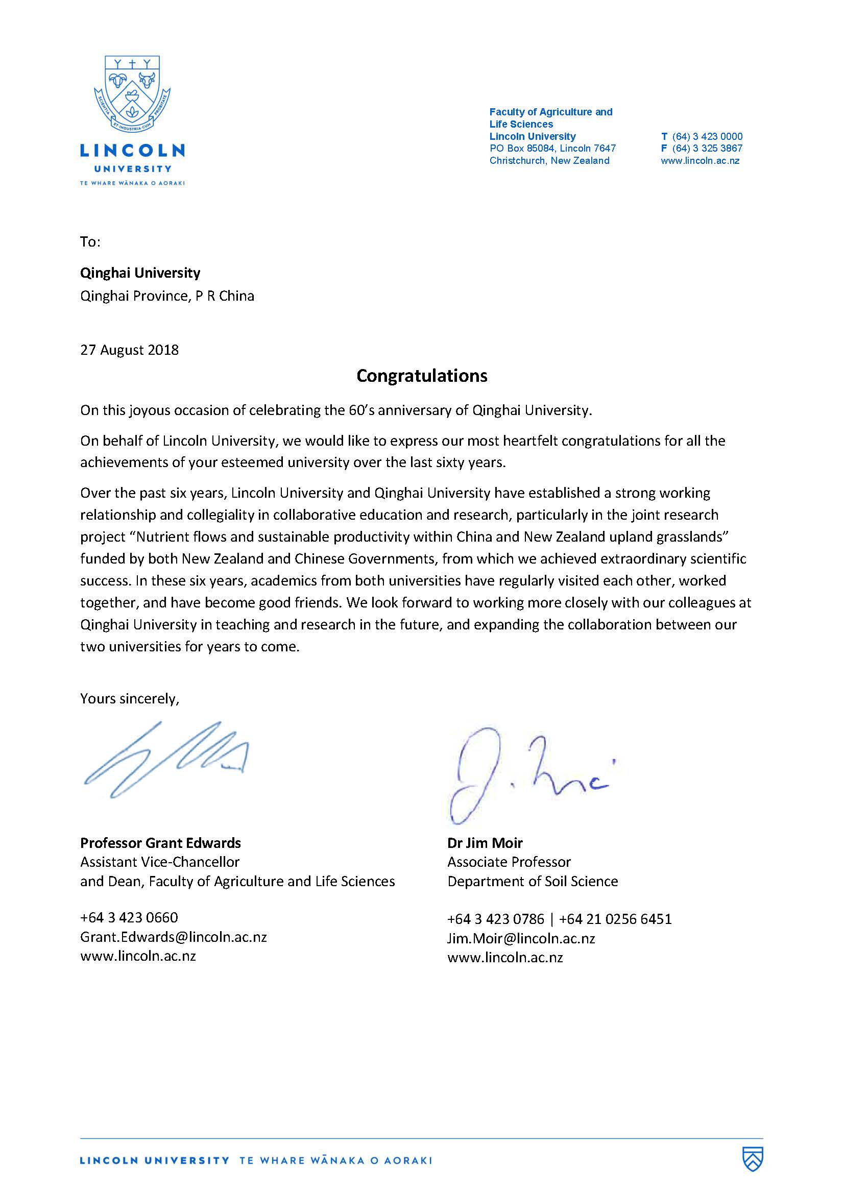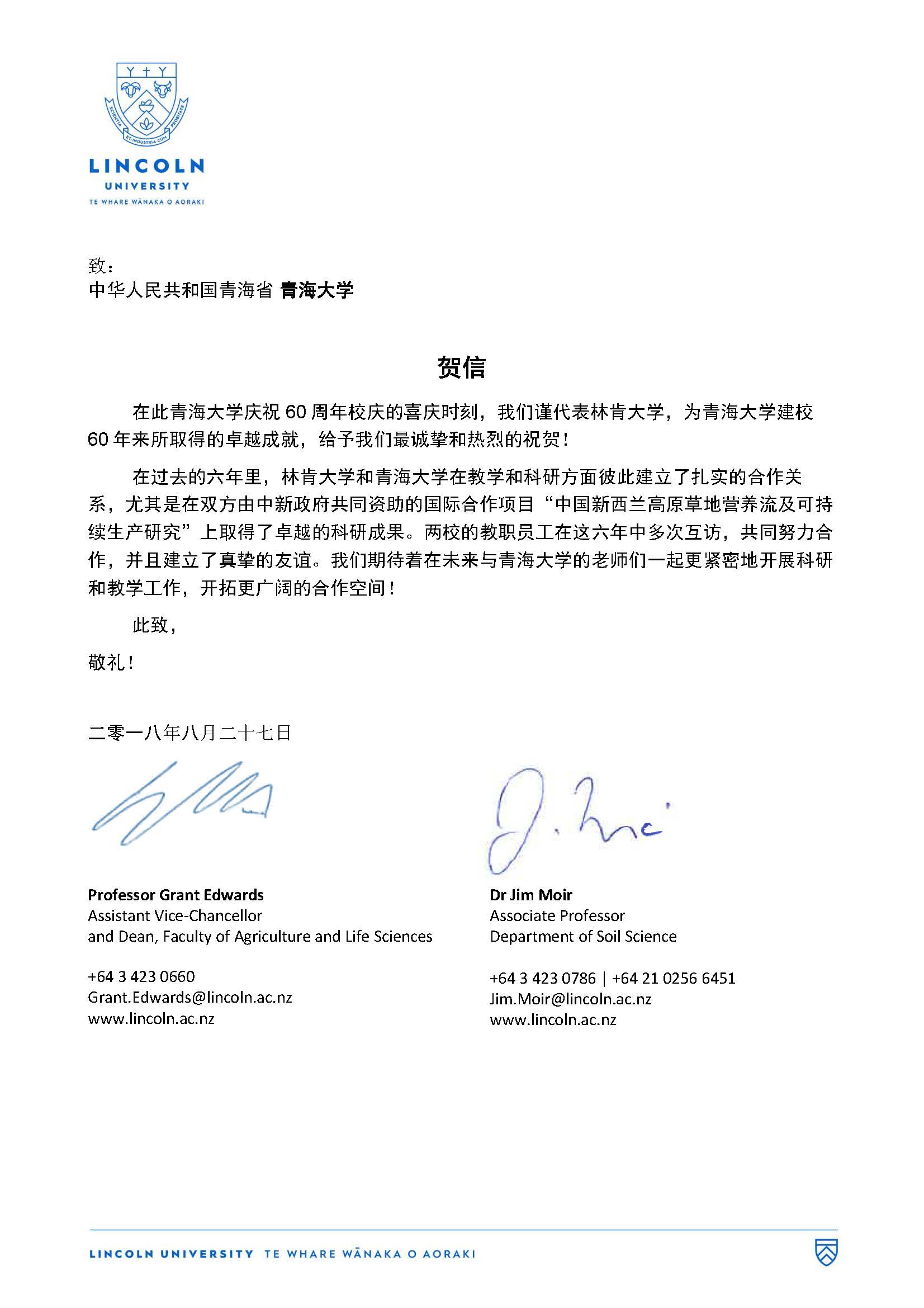 新西兰林肯大学贺信