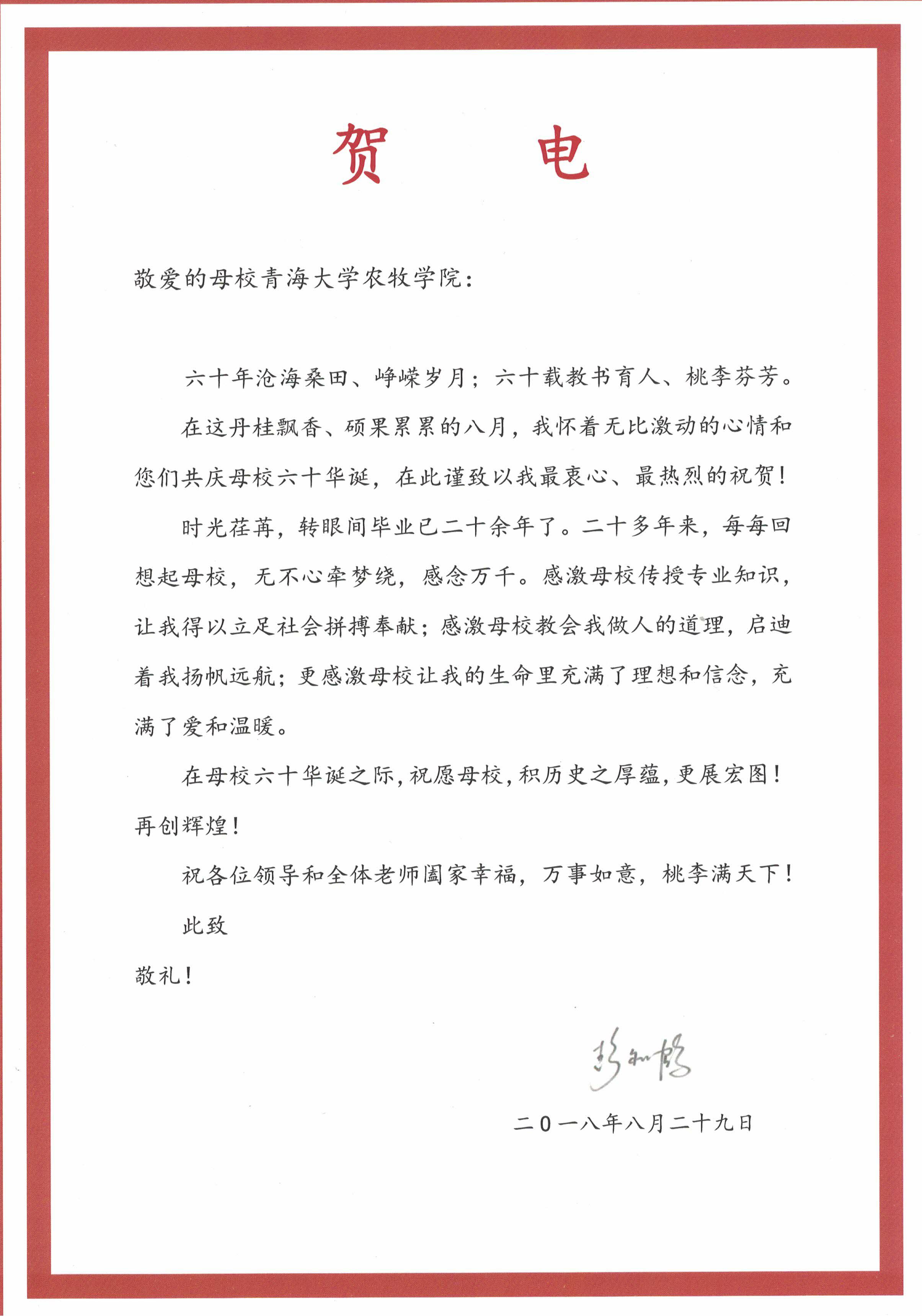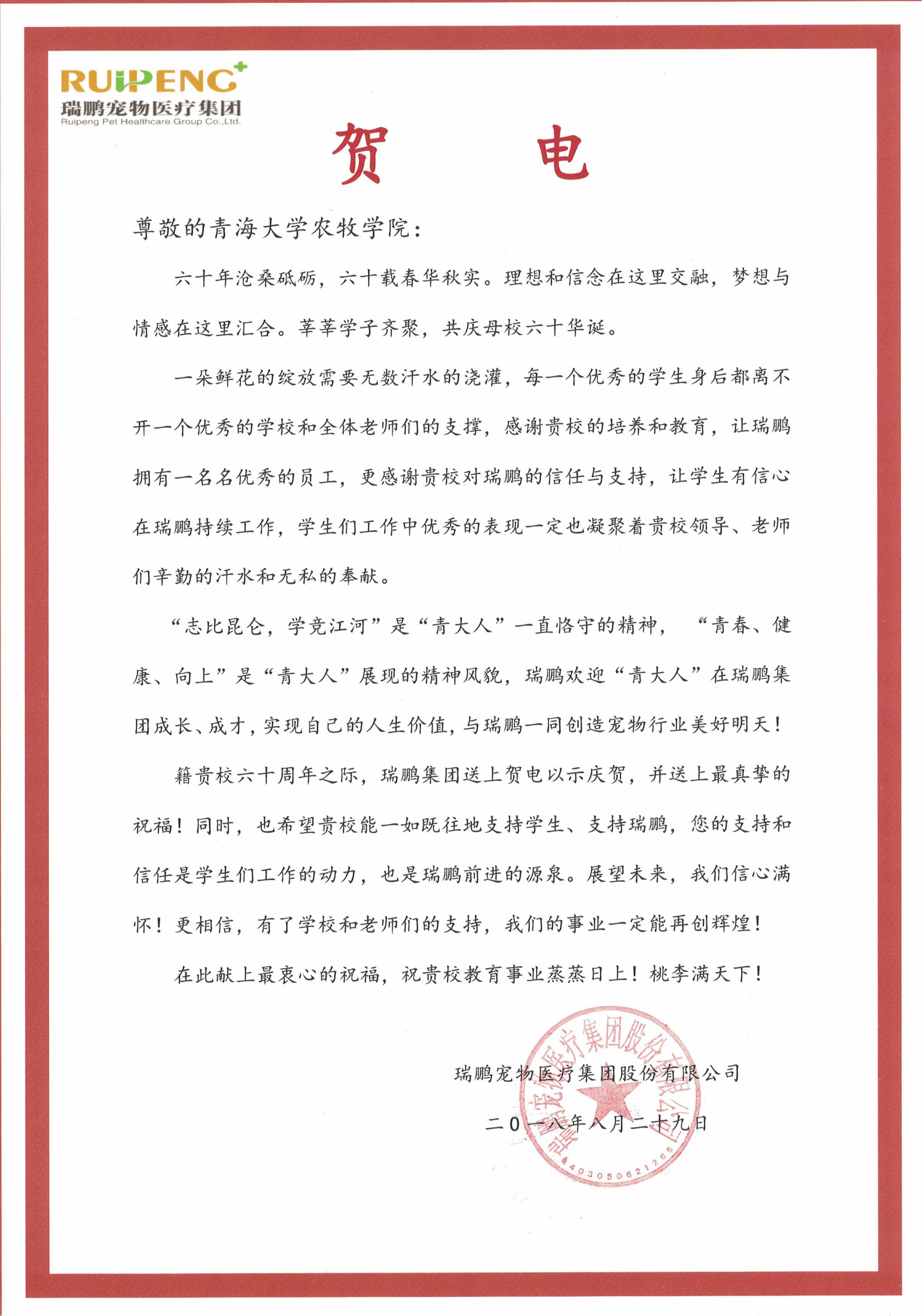 瑞鹏宠物医疗集团股份有限公司及杰出校友彭永鹤校庆贺电